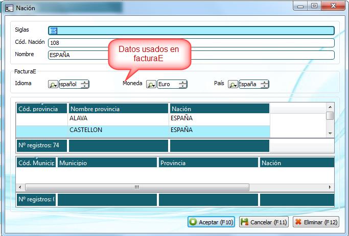 Cada nación utilizada en la aplicación, bien sea para los clientes o en la empresa, deberá tener asociado el correspondiente Idioma, Moneda y País del formato facturaE.