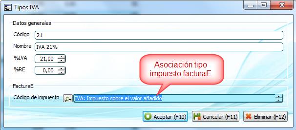 Cada tipo de IVA (impuestos en general), deberán tener su correspondiente asociación al tipo de impuesto de facturaE
