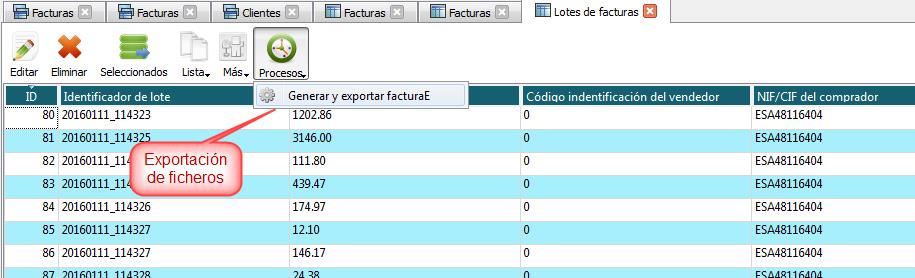 Para generar los ficheros correspondientes a cada lote de facturaE, seleccionaremos el proceso disponible en la rejilla de Lotes de facturaE: